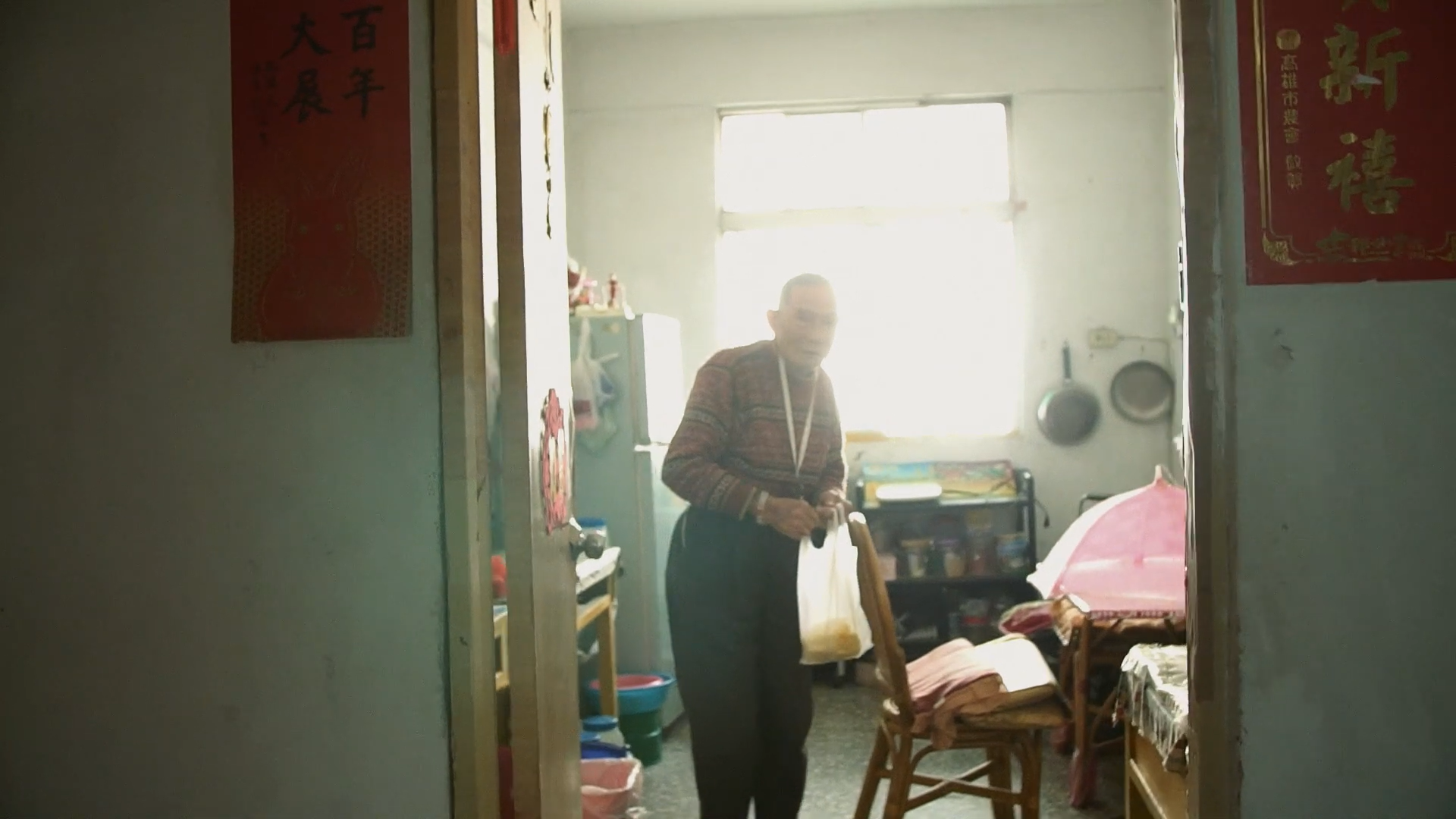 A2:《何以為家》的促成、拍攝,是很多因緣際會堆疊而成的紀錄片。在一次跟朋友的聚會中,他跟我說想做老榮民的口述歷史,沒有想拍成一部片,就只是把攝影機放著,把榮民伯伯大江大海的故事以及他們的身影拍下來。他說來到左營有一個單身宿舍,那個空間、氛圍及伯伯們的狀態像這個世界的平行時空,然後其中有個很酷的里長會幫這些伯伯們背骨灰回去。因為我剛好是岡山人,而單身宿舍離我家也不遠它就在左營,所以我想去看看,也想去認識這個很酷的里長。
