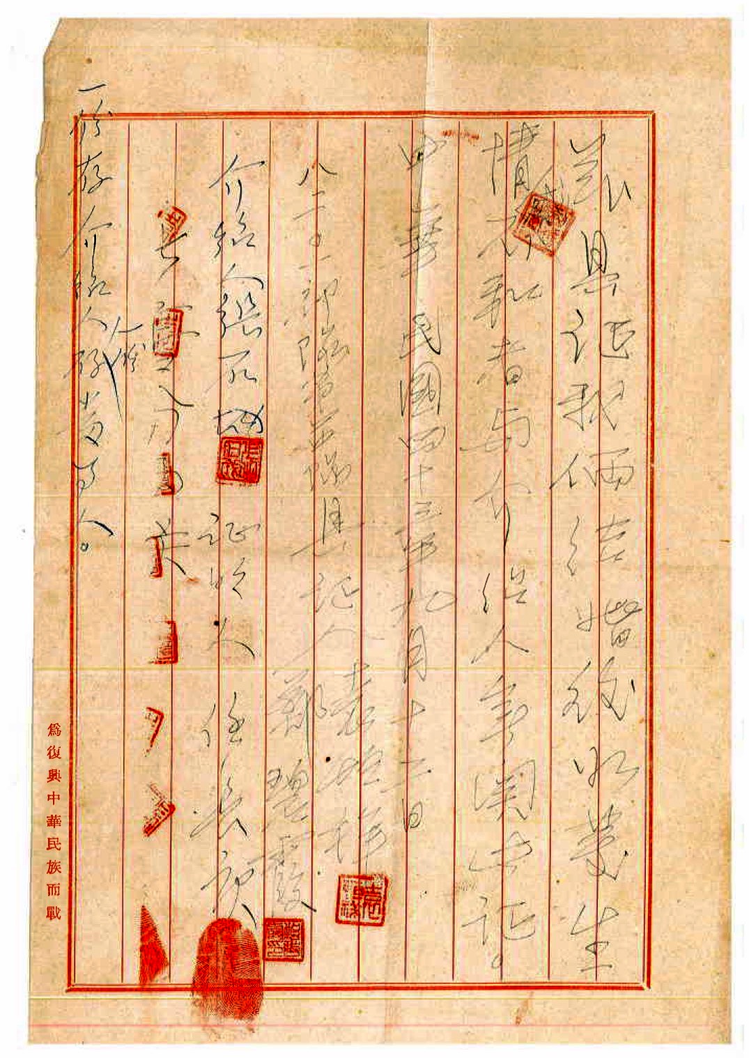 在宣傳方面可發揚大禹治水三過其門而不入的精神,並強調『我生則國亡、我死則國存』的觀念,今後不可再傳『回家團聚』的說法。[9]