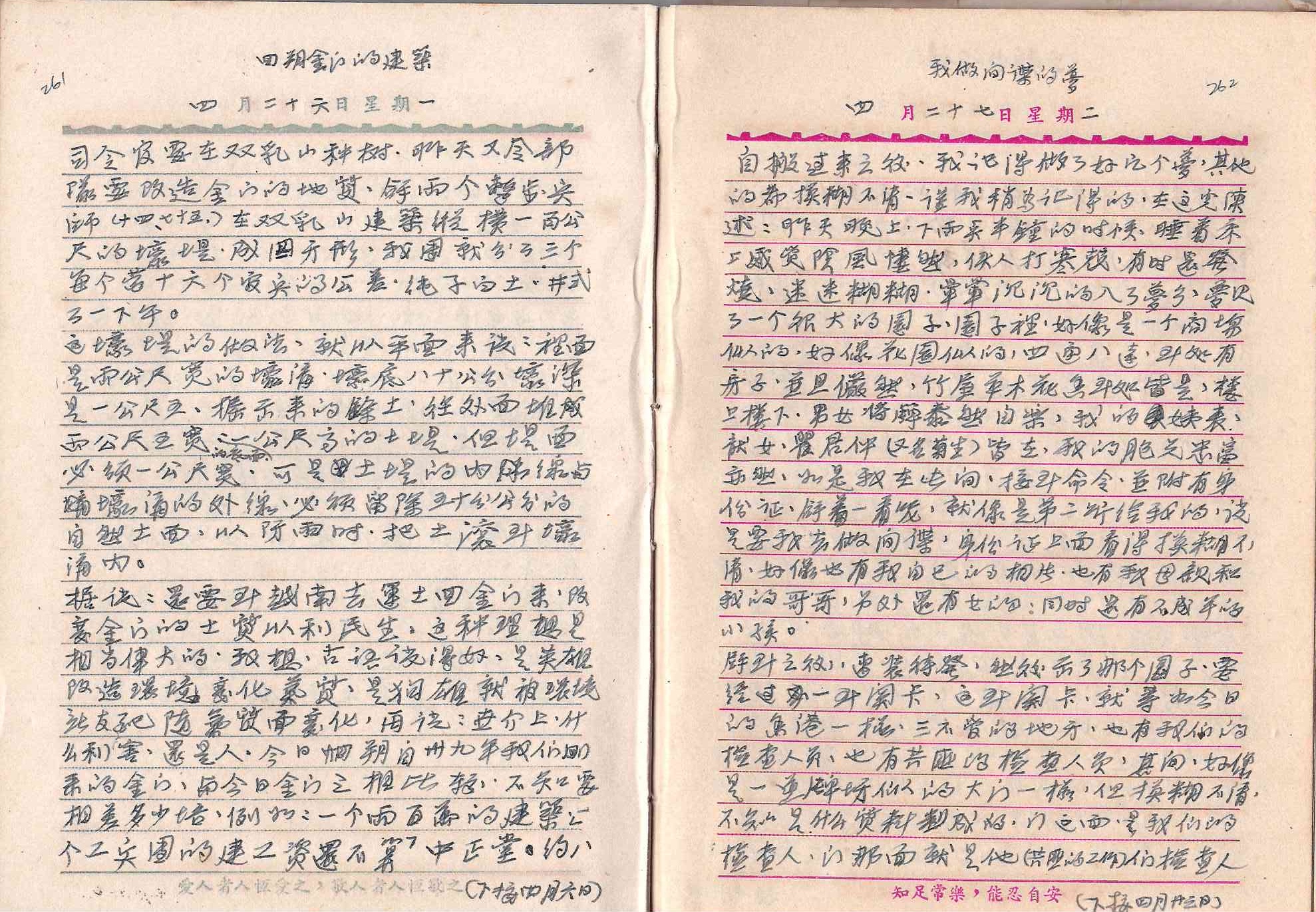 因為我今年已有廿五歲了,對於黨國可講毫無貢獻!憶我本身是一個忠孝不全的孩子,因我十五歲就出來,參加軍隊生活,對於孝,不能親奉慈母,將來唯恐亦難繼祖接代,因為什麼呢?我現在廿五歲,在軍隊十五年的生活,對於黨國革命的貢獻,無,自己的地位環境沒有混好,還是單獨一個人,想起來真孤單呀!真可怕耶!去他娘的屁,越寫越傷腦筋,老子從此以後決心拿我這本日記來做我一輩子的事業。這是我唯一的希望,也是我開心散悶娛樂的玩意。我決定拿日記來做我的終身伴侶吧![6]