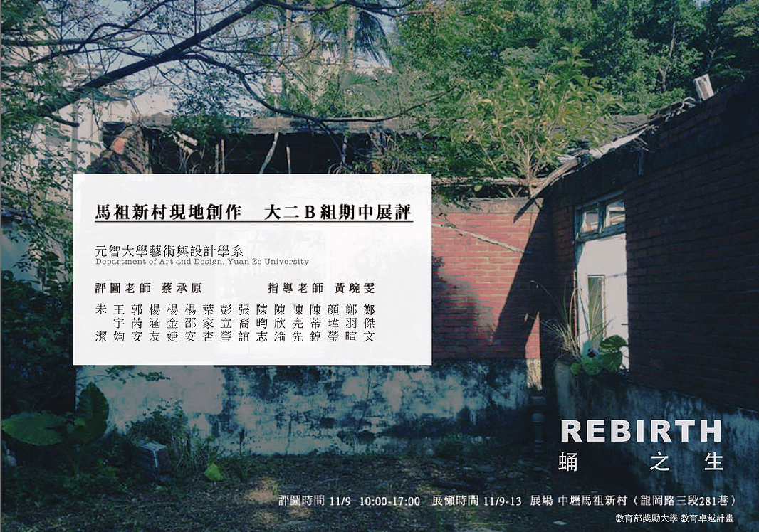 2014年初次來到馬祖新村參訪,當時有一半以上的眷舍還是雜草蔓生的廢墟,駐村藝術家正在缺少屋頂的眷舍裡展出作品。而原住戶胡明貴爺爺(馬村之寶)在馬村13號展出「吐納而就」書法展,他懷著湖南鄉音,熱情地招呼我們一群師生⋯⋯恍惚間我們又回到眷村時期人與人間的關係如同家人一般的親近與友好。之後的10年間,元智藝設系的學生在不同時期的馬村進行了現地創作、設計昆蟲攤車參與潮市集、在馬村公園進行秋日野餐比賽、測繪眷舍、訪談職人分析經營策略⋯⋯馬村的文化、建築和自然環境深深吸引我們在教學和創作上做不同的嘗試和探索。疫情期間,馬村少了遊客,卻充滿著熱鬧的蟬鳴鳥聲,我們突發奇想,若能夠在馬村有個基地能夠進行社區工作,以及學生創作和展覽的空間,該有多好呢!