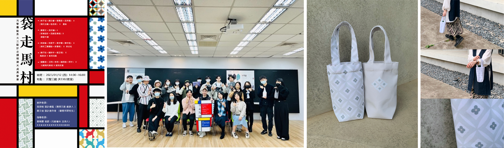 元智藝管所的學生在走訪馬村職人後發現,進駐的職人店家都非常具有創意和實力,但較缺乏交流和合作的機制,需要將資源整合以彼此增益,透過陪伴和共學,建立互助與合作的共好機制,並共同開發馬村的創意產品。團隊除了在馬村學堂和技能交換工作坊共同開發了一些具有潛力的手作產品,也透過課程設計將學生的創意、馬村印象和數位印花技術結合,創造符合馬村店家需求和特色的各種文創產品。以下舉「設計史」課程為例,來說明史論知識如何應用在文創產品的設計上,使設計的變化更為豐富,也與眷村的建築語彙和質感色彩產生關連。
