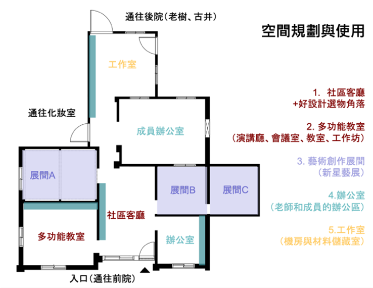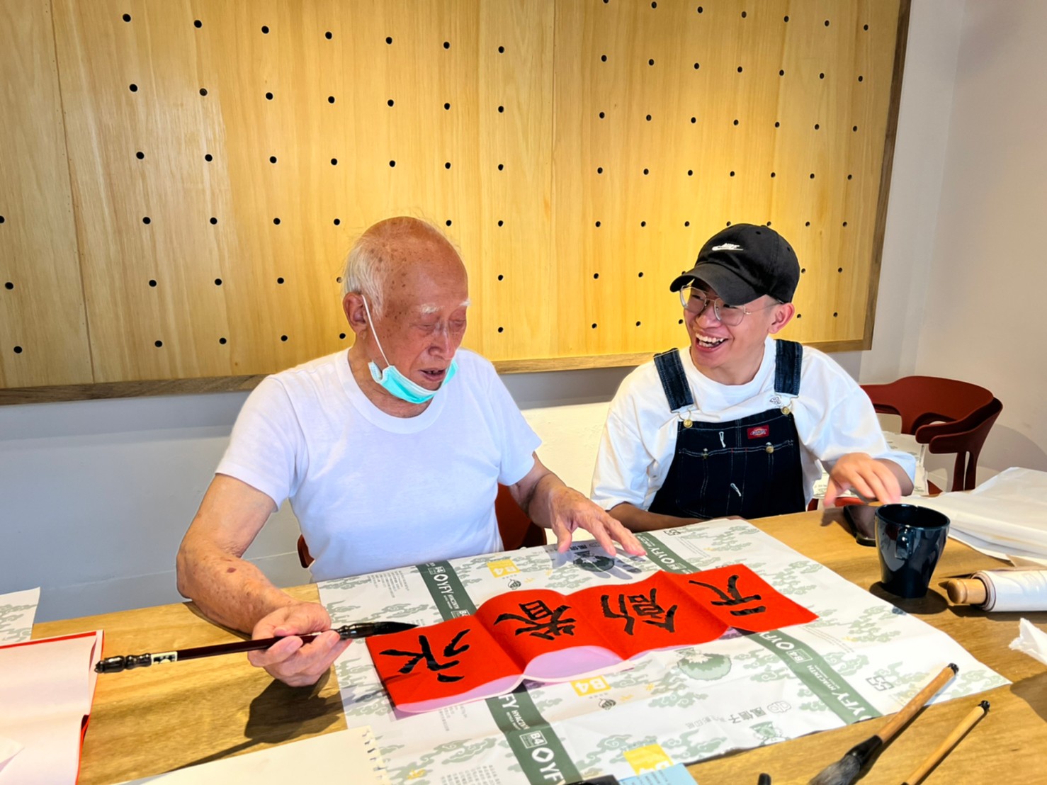 元創眷永的經營以「A社區參與共創、B職人串連共好、C地方青創培力」三個主軸為目標,每個主軸之下有4個子計畫,參與對象一致且活動連續,但不同主軸的子計畫也橫向串連彼此關聯,共12個子計畫。跨越了世代、文化背景和專業領域,不同的社群透過這個交流平台被連結起來。在基地開幕之前的籌備期,胡爺爺常常來到八號找我們談天,他也為「元創眷永」題字,基地logo和文宣上因為有胡爺爺的題字,變得更有意義和生命力。我們邀請他在居民技能交換工作坊教大家寫書法,他也常常從家裡搬來大量的作品與我們分享,但他對「眷永」兩字很在意⋯⋯我們解釋道:「這並不是要永遠保存眷村的建築,而是期待眷村的精神能被年輕世代傳承,並永續經營喔!」