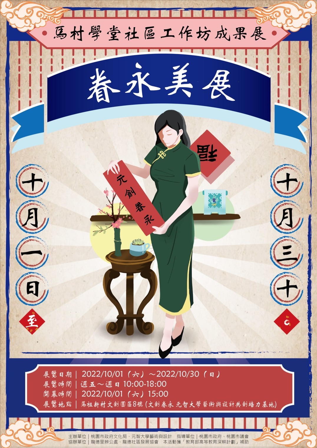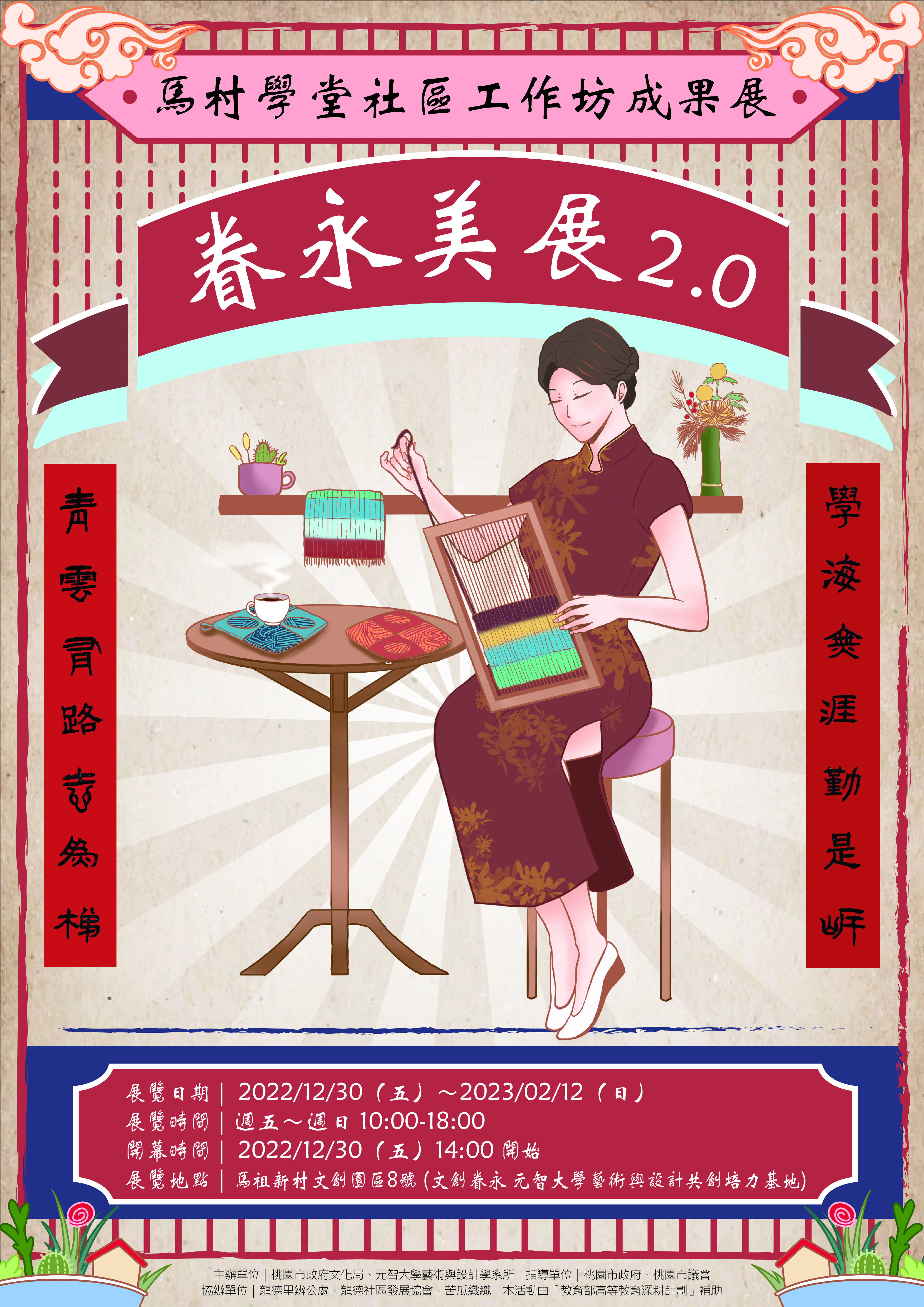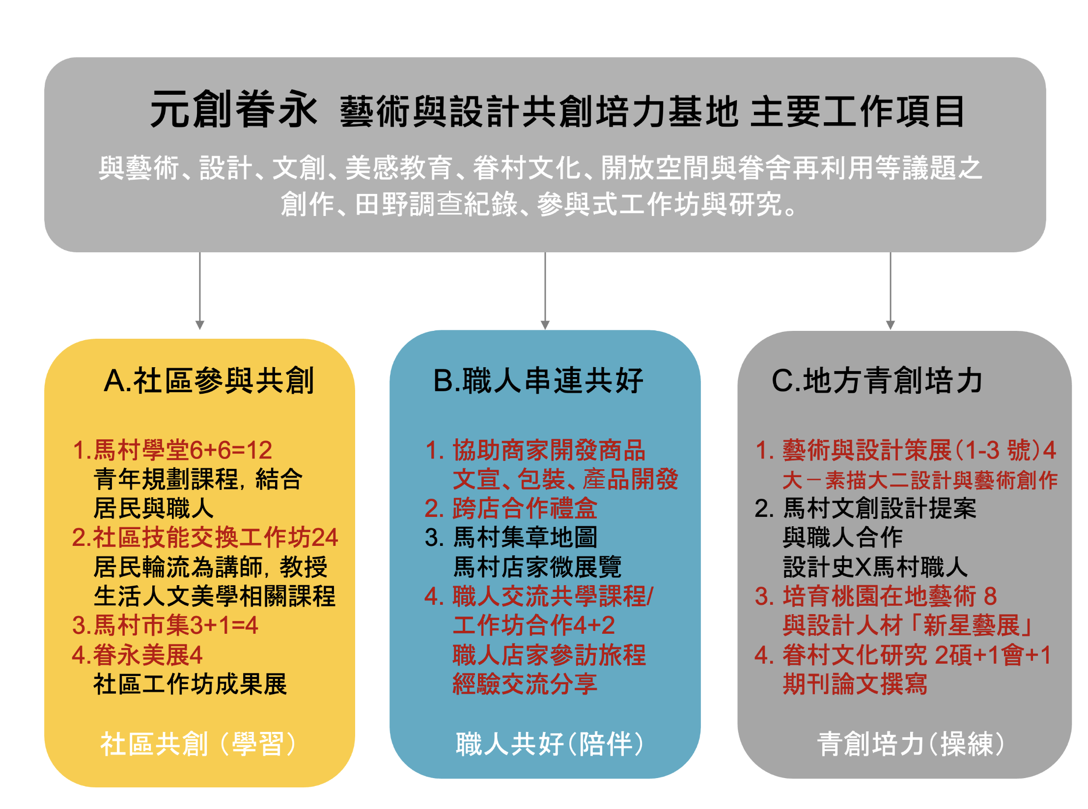 「元創眷永」為元智藝設系於馬村之共創培力基地,以社區參與、職人共好、青創培力為目標,在人的連結中共同創造地方新的價值。透過「馬村學堂」等社區工作坊聯繫居民、職人與學子,共同探索馬村的生活美學與眷村文化。「新星藝展」與Atelier Original展出青年藝術家創作、社會創新品牌與產學合作開發之成果。
