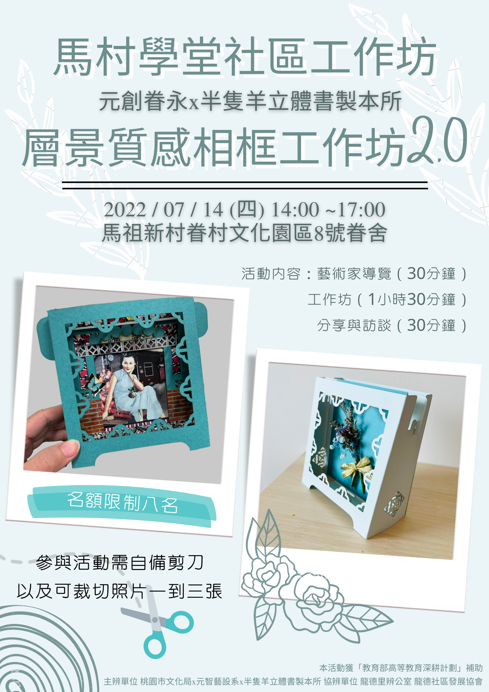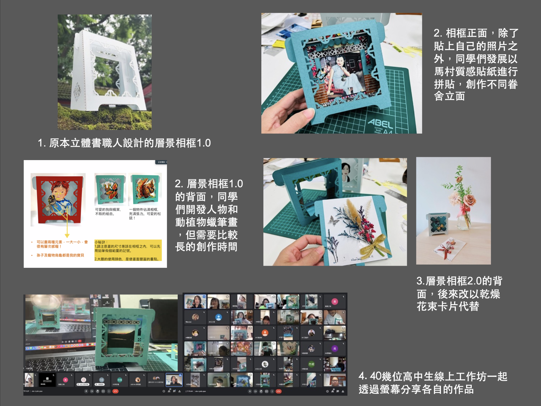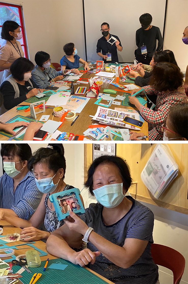 以「層景質感相框工作坊」為例,半隻羊立體書職人葉老師替工作坊設計了三款精緻的紙相框,最後學生選定以眷村故事館入口大門的建築樣式為主體框架的方形相框,並印製了很多馬村常見的質感貼紙,包括磚石、磁磚、花草與動物昆蟲等,讓居民在貼上自己帶來的老照片之後,還能用貼紙裝飾與拼貼出自己喜愛的眷舍立面 ; 相框背面則是繪畫專長的學生教導居民用蠟筆畫畫出家人或寵物,一個相框工作坊包含三項美感技術:繪畫、拼貼和立體相框組構,所以居民花了三個多小時才陸續完成作品(2.0版本與給高中生的線上美感課程,背面簡化為乾燥花的製作),但從工作坊問卷得知,大部分的學員雖然覺得有難度,但都玩得很開心,也很有成就感,回到家之後也很開心與家人展現工作坊的成果。完成作品後,我們讓大家輪流分享自己帶來的老照片背後的故事,有人分享自己兒子的結婚照、有人分享自己年輕時頂著龐克頭騎野狼機車的帥照、也有人分享自己爸媽年輕時的照片⋯⋯在馬村學堂不但能夠學習到美感技術與生活美學,也能分享彼此的生命經驗與故事。