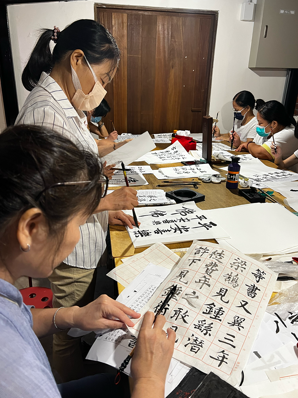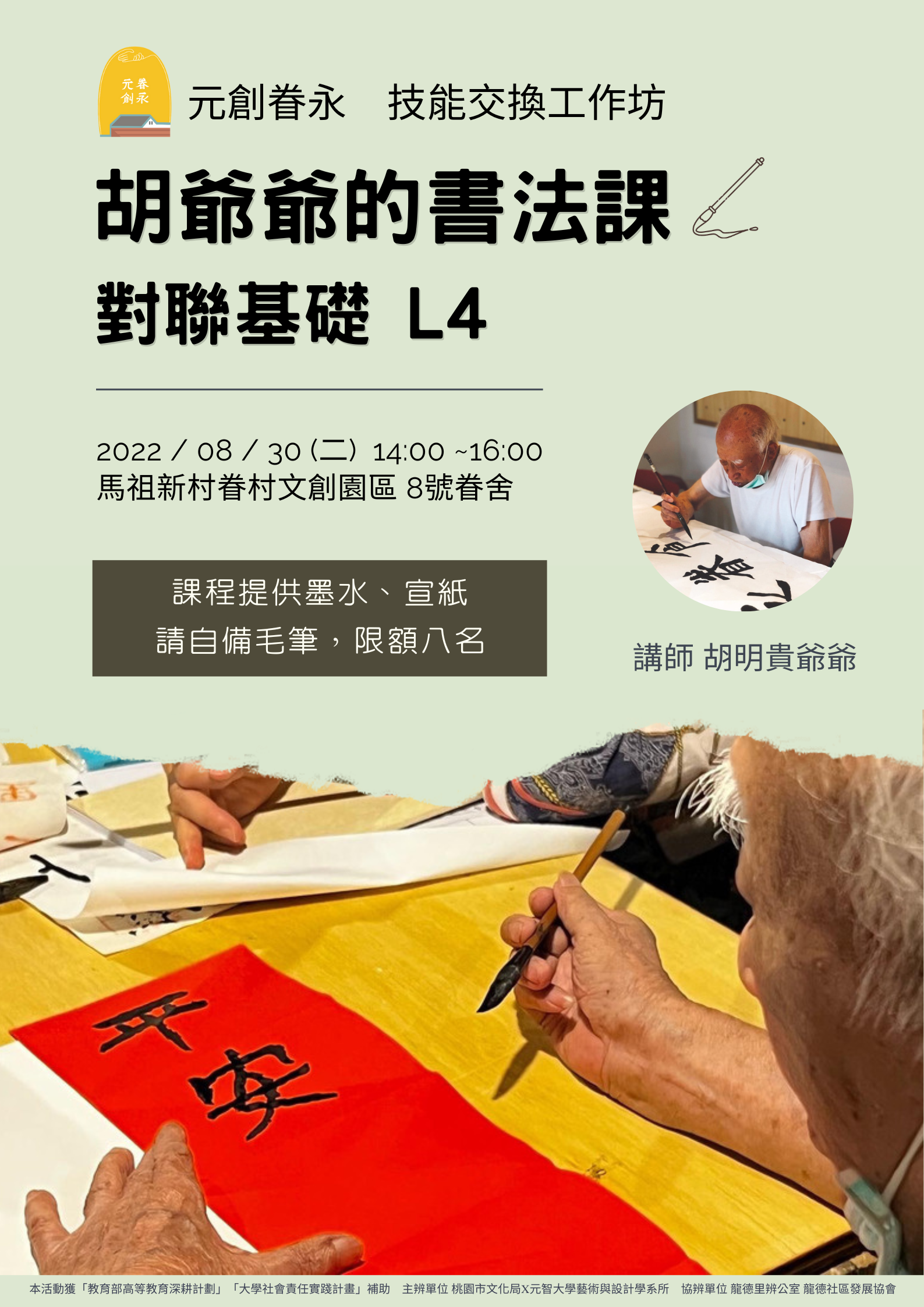 「馬村學堂」受到居民好評之後,我們漸漸地與學員熟悉,知道她們的興趣專長,所以衍生出邀請居民輪流擔任講師的想法。「社區技能交換工作坊」第一位講師當然是胡爺爺,雖然他常常開書法展,也精通各種字體,卻是第一次教書法,所以第一堂課比較像是「胡爺爺講故事」,學習效果不太好。元智團隊花了一番工夫與爺爺溝通,尋找適合初學者的字帖,減少學員人數,讓大家從習字基礎握筆開始學習,也重新規劃課程內容。第二堂課才漸入佳境,參與的學員也給我們很好的回饋,居民感受到元智團隊的用心,以及胡爺爺的個人魅力,漸漸地了解元創眷永舉辦的社區工作坊的目的和方式確實不同以往他們所經驗的DIY社區工作坊。