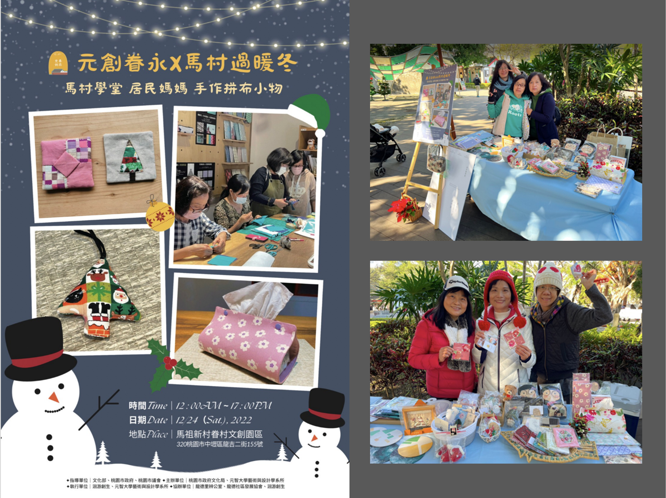 馬祖新村從轉型為文創園區之後,就固定一個月辦理一次「馬村市集」,可惜的是市集販售的產品大都與其他市集重複,也少有眷村特色。初次參與市集的學生根本無商品可販售,於是跟居民募集了二手書和二手衣、手作點心,想以「以物易物」和「交換故事」等無成本的經營方式來吸引遊客,但適逢雨天來客不多,結果是不敷成本。正當我們苦思要在市集販售什麼才能吸引人氣之時,擔任拼布工作坊講師的群芳老師覺得大家的作品還不錯,可以量產一起參加「馬村聖誕市集」,這個提議獲得多數學員的支持,在市集開辦前兩週,學員們每天都來元創眷永加班製作市集要販售的聖誕小物,也因為要賣得好價錢,拼布老師加課指導大家把作品修得更完整和完美,學員們大都是退休的主婦,但她們主動將每件產品拍照、編號再製成表格,也自發地輪流排班來擔任攤位店長。市集當天每位美麗的店長都穿得很聖誕風,吸引很多遊客和朋友家人圍觀購買,最後的收入也令我們很驚奇的好,這次參與市集的成功,為學員們帶來信心,接著一起規劃辦理她們在社區工作坊中的作品成果展「眷永美展」。