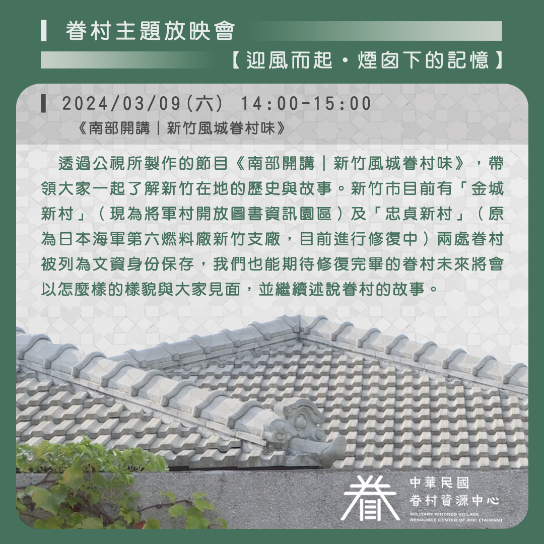 2024年3月份的放映會以「迎風而起・煙囪下的記憶」為主題。透過公視所製作的節目《南部開講|新竹風城眷村味》,帶領大家一起了解新竹在地的歷史與故事。新竹市目前有「金城新村」(現為將軍村開放圖書資訊園區)及「忠貞新村」(原為日本海軍第六燃料廠新竹支廠,目前進行修復中)兩處眷村被列為文資身份保存,我們也能期待修復完畢的眷村未來將會以怎麼樣的樣貌與大家見面,並繼續述說眷村的故事。