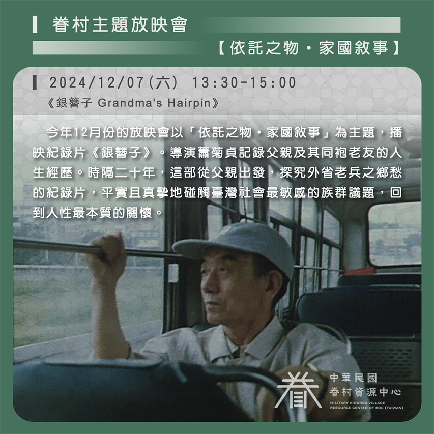 2024年12月份的放映會以「依託之物・家國敘事」為主題,播映紀錄片《銀簪子》。導演蕭菊貞記錄父親及其同袍老友的人生經歷,呈現那顛沛流離的時代,戰爭對人帶來的殘酷影響。改革開放後闊別四十年的重逢,家鄉早已人事全非,無論最終認同哪一片土地,終究無以磨滅對家永無止盡的牽掛。時隔二十年,這部從父親出發,探究外省老兵之鄉愁的紀錄片,平實且真摯地碰觸臺灣社會最敏感的族群議題,回到人性最本質的關懷。