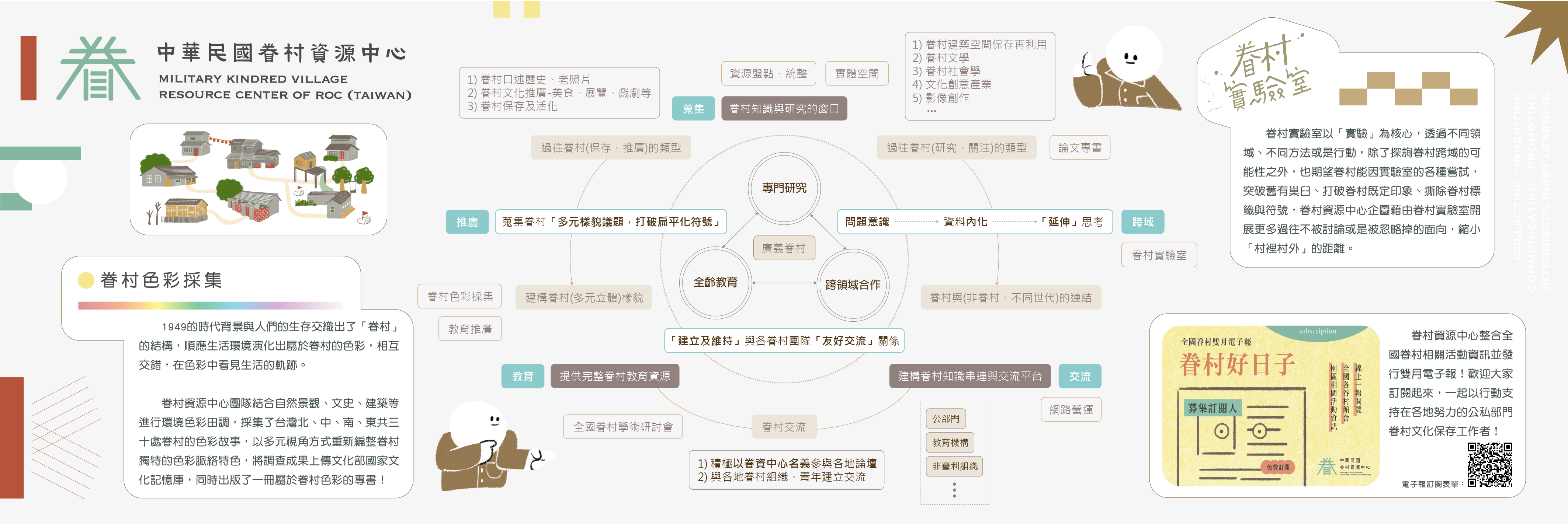 桃園市政府深耕眷村文化保存推廣20餘年,延續過往成果與動能,與財團法人榮民榮眷基金會合作設立「桃園眷村資源中心」。以「蒐集、教育、交流、推廣、跨域」為使命,教育推廣為核心,建構一個全國性眷村知識串聯與交流平台。透過集結各地眷村保存推廣能量,期望將榮民及眷村之珍貴記憶傳承之下一代,一同擘劃未來眷村的各種可能性。