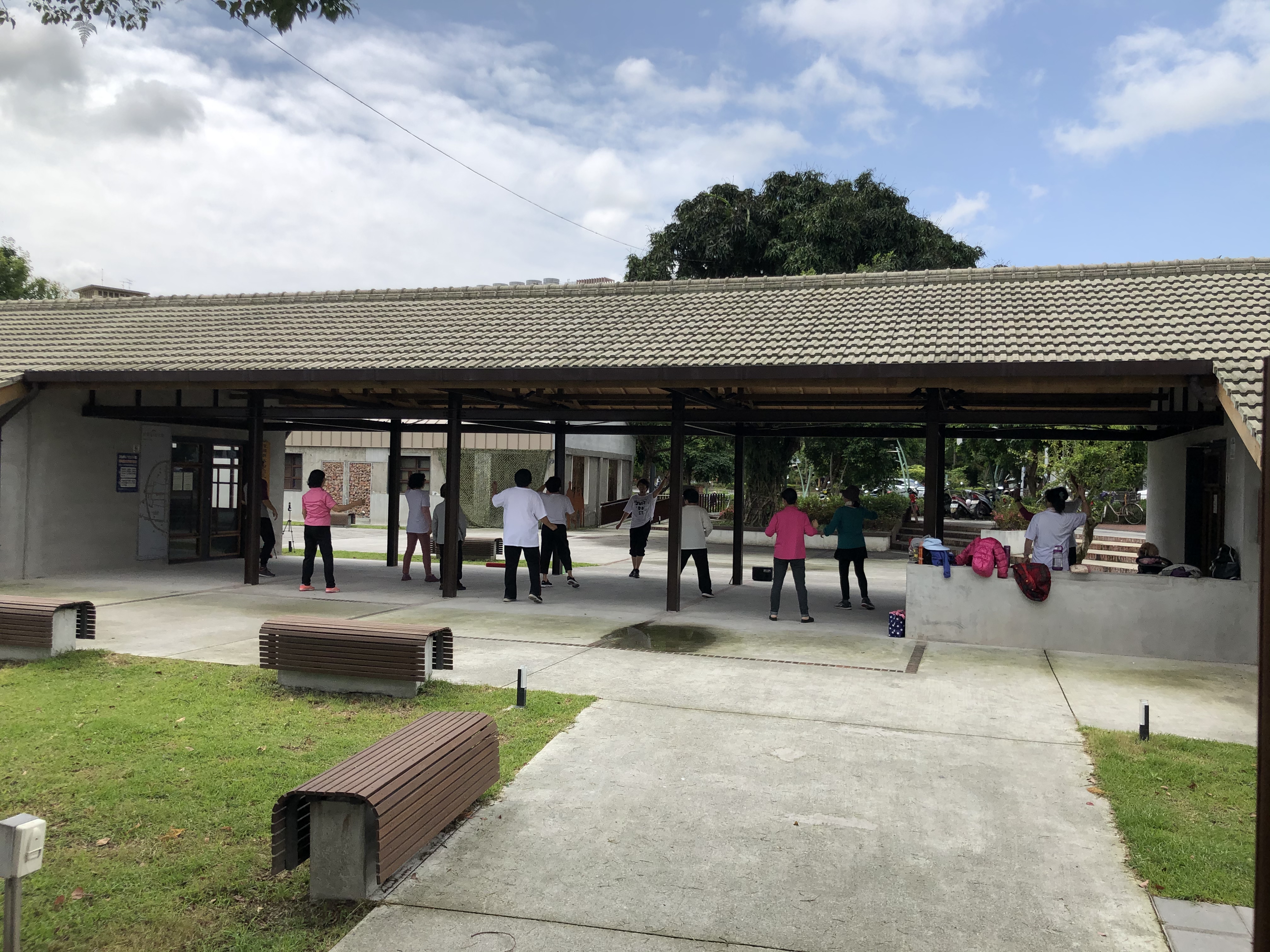 另外,例如在日式眷舍C棟,部分空間也因為住戶生活需求被改建成磚構造,甚至增建的規模幾乎達到原有建築本體的兩倍,經過將部分區域拆除並改造成木平台,如此不僅仍可看見以前增建痕跡,也不阻擋眷舍本體風貌,更可以讓木平台處理出無障礙空間而達到空間平權的目地;日式眷舍B棟也同樣拆除部分增建而重塑建築本體的完整性,也藉此將增建區域打開形成更好的全區動線。近代眷舍2號棟也進行了較大膽的處理:將原本六戶的構造牆體進行更動,將中間三戶改為半戶外空間,再把原有牆體依原位置以地面的磚來排列,如此人們可以透過磚的痕跡指認出每一戶的原有位置,如果以完全復舊的方式處理,就不會有現在成為民眾停留場所的樣子,正是透過這樣的手法,結合來自南門園區的動線而將這個場域營造出一處半戶外的入口意象,讓化龍一村這個場所成為民眾可以隨時前來並舒適行動的活動場所,無論是周末或平日,都可以看到小朋友來這邊上課、居民邀集彼此在這裡運動、跳舞、交誼的畫面,真正是宜蘭市民的客廳,非常有趣,並且不受豔陽、雨天的影響。