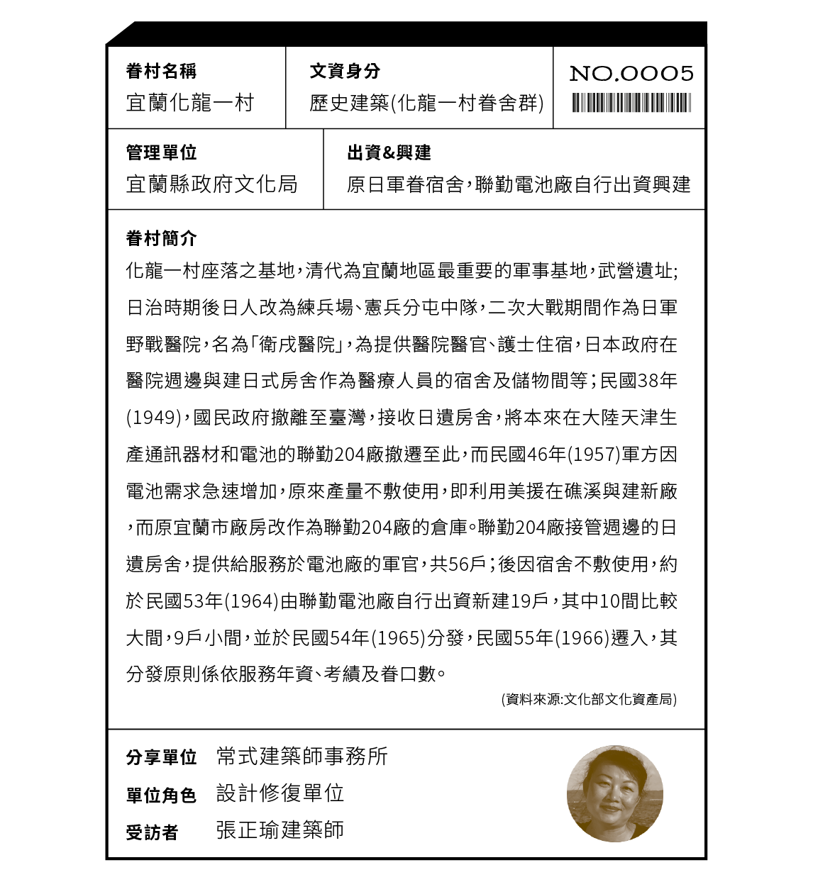 配置圖上右側粉紅色的部分就是大約興建於民國五、六零年代的近代眷舍,從右上角開始分別稱為1號棟、2號棟、3號棟(及其附棟)、4號棟及5號棟;左側則是日式眷舍:中間為「A棟」,左上為「B棟」(尚未開始修復工程)以及左下角的「C棟」,整體稱為「宜蘭縣歷史建築化龍一村眷舍群」。它的狀況特殊,並沒有一個共通的年代,甚至從更早的地圖或影像來看還有更多眷舍,隨著時代演進而慢慢被拆除,最後留存現今的八棟眷舍,形成了一宗基地上留有各時代的建築痕跡的情形,也因此設計團隊在進行修復設計時,便沒有從「要以哪個年代為基準」的角度去介入,相反地,是採取包含此時這個當代在內、讓每個「過去的當代」並陳的角度來看待。