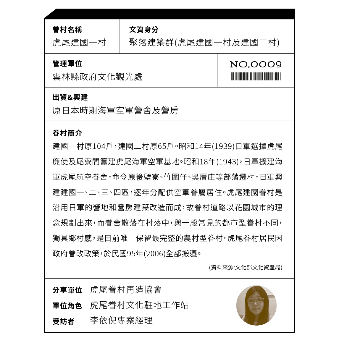 雲科團隊於2007年(民96)因文建會(今文化部)推動「全國未改建眷村文化潛力發掘普查計畫」,開始有一系列的虎尾眷眷村的田野調查,也引動了後續的眷村保存行動。