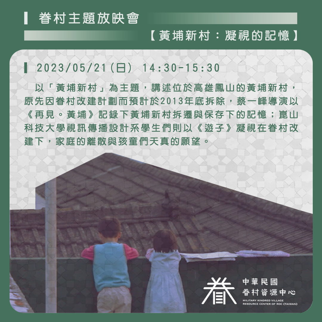 放映會以「鳳山黃埔新村」為主題,講述位於高雄鳳山的黃埔新村,原先因眷村改建計劃而預計於2013年底拆除,蔡一峰導演以《再見。黃埔》記錄下黃埔新村拆遷與保存下的記憶;崑山科技大學視訊傳播設計系學生們則以《遊子》凝視在眷村改建下,家庭的離散與孩童們天真的願望。