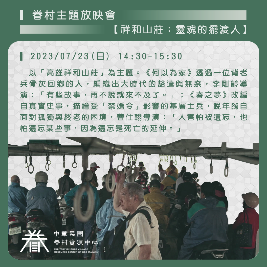 放映會以「高雄祥和山莊」為主題,講述住在高雄左營海軍「單身退員宿舍」榮民伯伯們的生命故事。1952年,當時政府為了維持軍人在「接戰地區」沒有後顧之憂,頒布了《戡亂時期陸海空軍軍人婚姻條例》,也就是後來俗稱的「禁婚令」,限制底層士兵組成家庭,而住在祥和山莊的軍人們受限於「禁婚令」,既回不了家鄉,也不被允許在台灣成家,只好在政府劃設的狹小住所裡面生活幾十年。