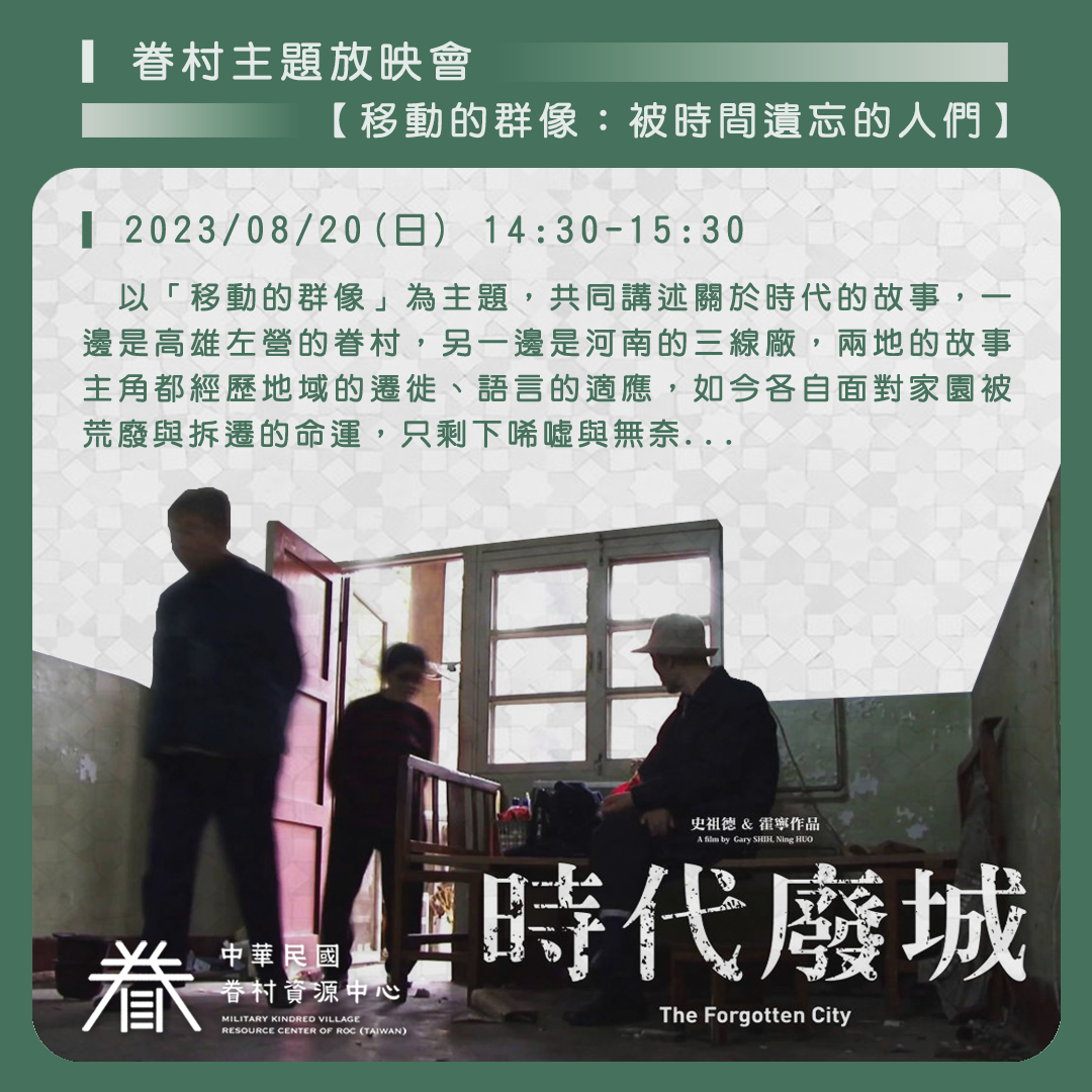 放映會以「移動的群像」為主題,共同講述關於時代的故事,一邊是高雄左營的眷村,另一邊是河南的三線廠,兩地的故事主角都經歷地域的遷徙、語言的適應,如今各自面對家園被荒廢與拆遷的命運,只剩下唏噓與無奈…