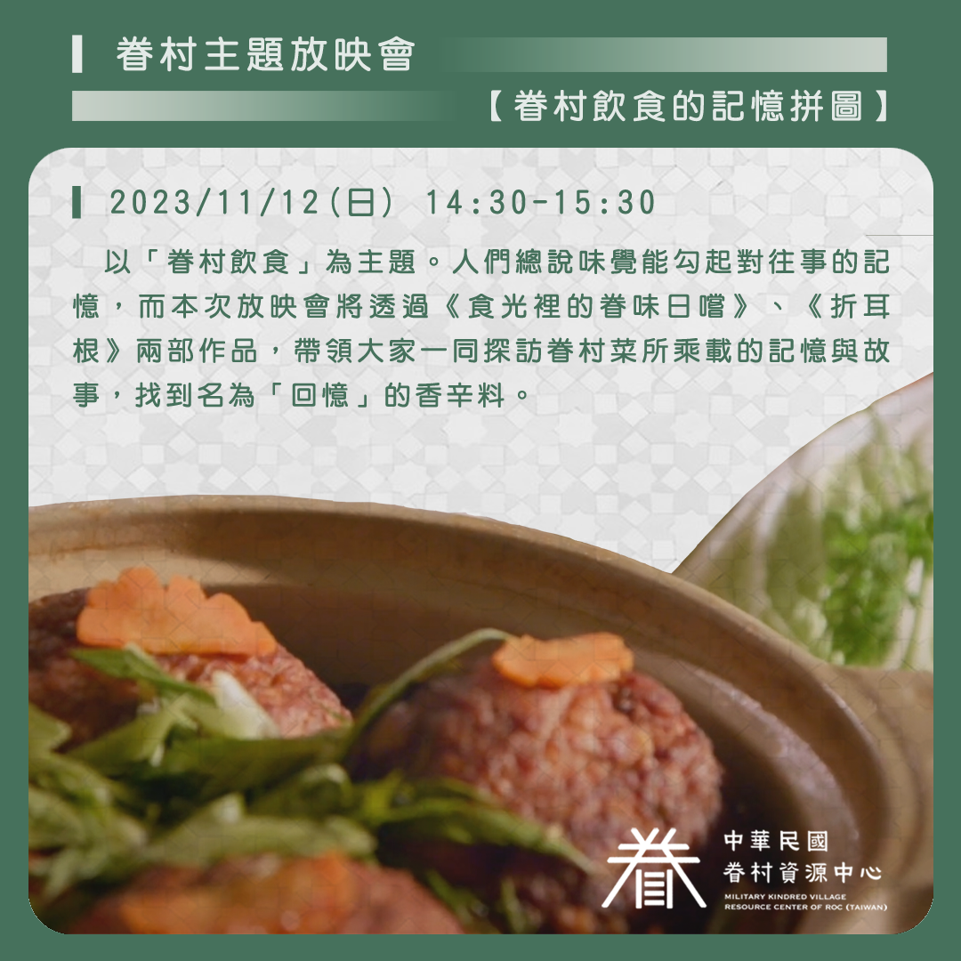 放映會以「眷村飲食」為主題。人們總說味覺能勾起對往事的記憶,而本次放映會將透過《食光裡的眷味日嚐》、《折耳根》兩部作品,帶領大家一同探訪眷村菜所乘載的記憶與故事,找到名為「回憶」的香辛料。