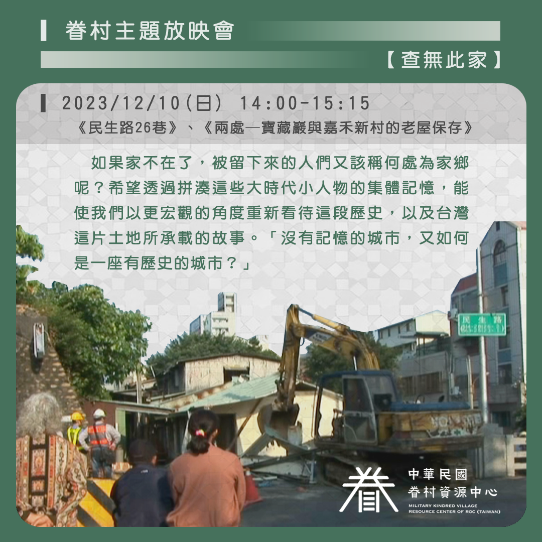 放映會以「查無此家」為主題。如果家不在了,被留下來的人們又該稱何處為家鄉呢?希望透過拼湊這些大時代小人物的集體記憶,能使我們以更宏觀的角度重新看待這段歷史,以及台灣這片土地所承載的故事。