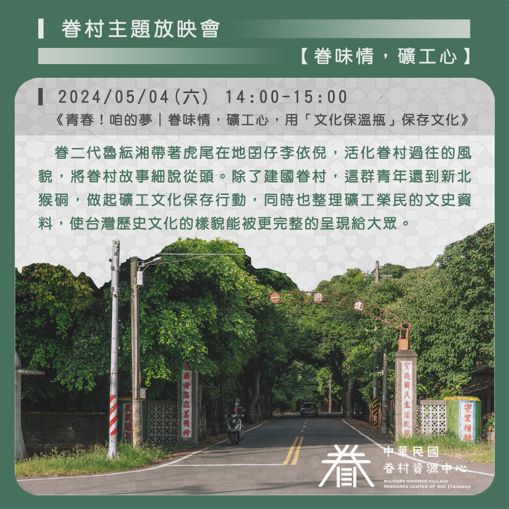 放映會以「眷味情・礦工心」為主題,播映公視所製作的節目《青春!咱的夢|眷味情,礦工心,用「文化保溫瓶」保存文化》。雲林縣虎尾鎮在二戰尾期是日本海軍的航空基地,也是訓練神風特攻隊跟兵舍的所在。隨著二戰結束,由中華民國空軍接收並沿用虎尾飛機場等附近的軍事基地,設立建國眷村(建國一、二、三、四村)。在2005年,國防部執行老舊眷村改建條例,住戶搬遷之後這裡便荒廢許久。眷二代魯紜湘帶著虎尾在地囝仔李依倪,活化眷村過往的風貌,將眷村故事細說從頭。除了建國眷村,這群青年還到新北猴硐,做起礦工文化保存行動,同時也整理礦工榮民的文史資料,使台灣歷史文化的樣貌能被更完整的呈現給大眾。