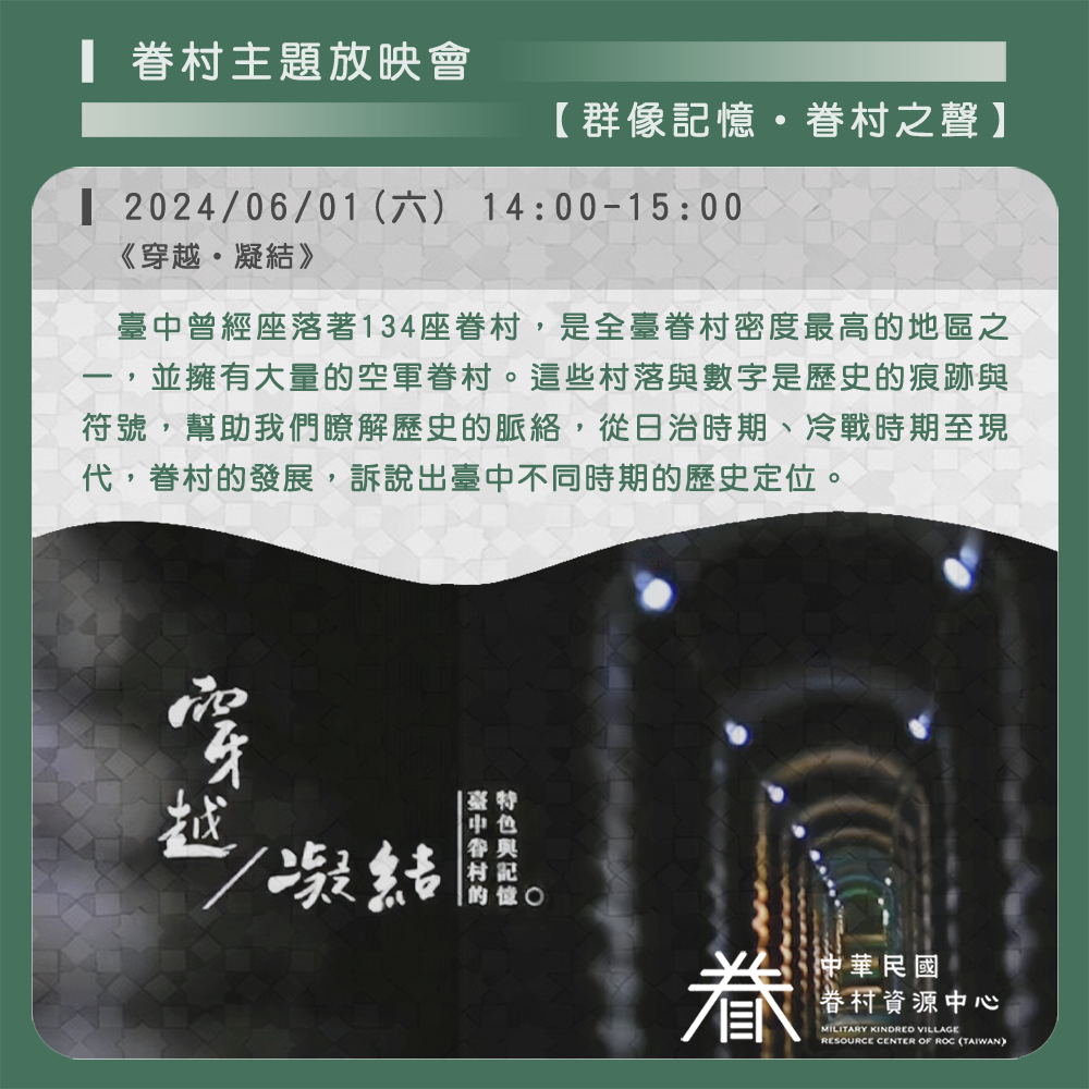 放映會以「群像記憶・眷村之聲」為主題,播映臺中市眷村口述歷史紀錄片《穿越・凝結》。導演為靜宜大學大眾傳播學系的奚浩老師,同時也是臺中「大家書房」創辦人。奚浩老師本身為空軍子弟,過去曾參與臺中眷村田野調查,拜訪過數個眷村,並同時拍攝眷村口述歷史紀錄片《穿越‧ 凝結》,對忠義社區的印象特別深刻。這裡是臺中唯一還有人居住的老眷村,隨著政府裁軍,部分眷戶遷入國宅,老榮民相繼凋零,近年來增加許多外籍配偶,加上不少原住民因工作關係遷入賃屋而居,讓這裡呈現多元族群的特色。