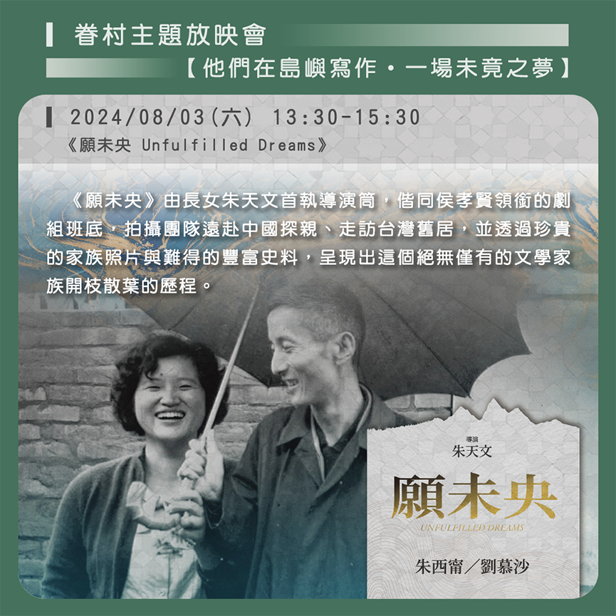 放映會以「他們在島嶼寫作・一場未竟之夢」為主題,播映紀錄片《願未央》,由長女朱天文首執導演筒,偕同侯孝賢領銜的劇組班底,拍攝團隊遠赴中國探親、走訪台灣舊居,並透過珍貴的家族照片與難得的豐富史料,呈現出這個絕無僅有的文學家族開枝散葉的歷程。他們將生活過得簡樸,但對於文學終其一生不能平凡的大願,依然在第二代女兒的紙筆中虔誠地追逐著