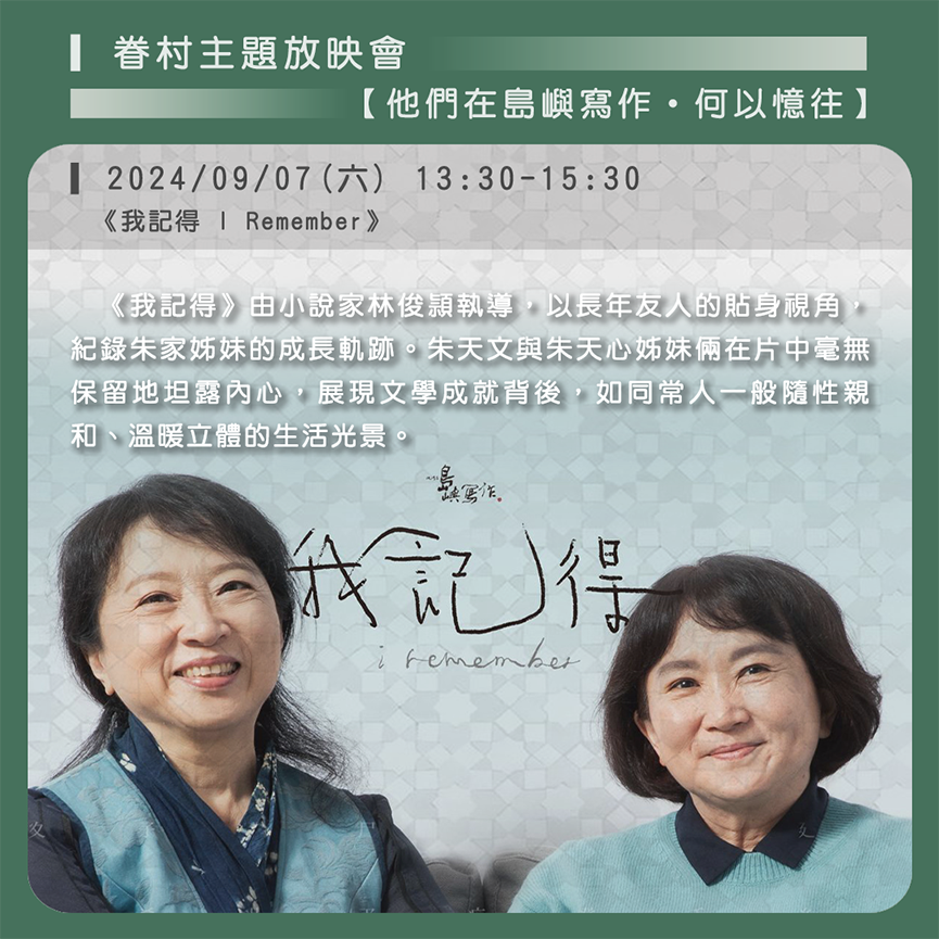 放映會以「他們在島嶼寫作・何以憶往」為主題,播映紀錄片《我記得》,由小說家林俊頴執導,以長年友人的貼身視角,紀錄朱家姊妹的成長軌跡。姊妹倆在片中毫無保留地坦露內心,展現文學成就背後,如同常人一般隨性親和、溫暖立體的生活光景