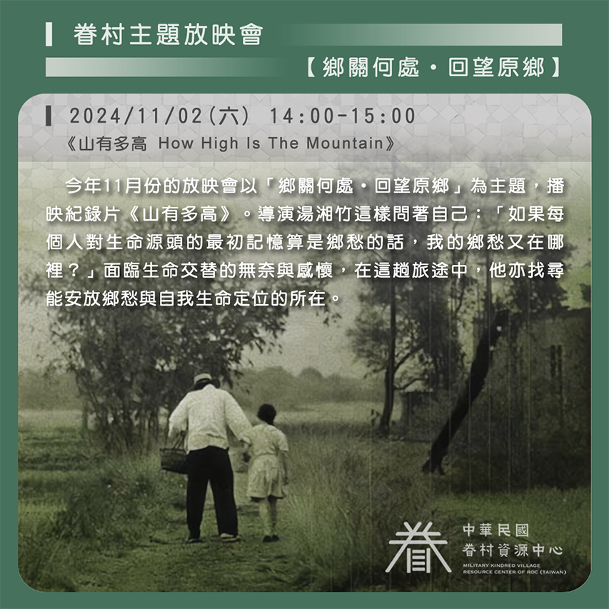 放映會以「鄉關何處・回望原鄉」為主題,播映紀錄片《山有多高》。導演湯湘竹這樣問著自己:「如果每個人對生命源頭的最初記憶算是鄉愁的話,我的鄉愁又在哪裡?」「湘」是中國湖南,「竹」是臺灣新竹。湯湘竹的名字分別是父親與自己的出生地,也承載父親對於故鄉的思念。在兒子甫出生,年邁父親中風之際,他決定陪伴父親回到久違的故鄉。即使自己對於此地全然陌生,卻是父親生命中重要的部分;一如新生兒子往後的未來,自己不可能全然參與。面臨生命交替的無奈與感懷,在這趟旅途中,他亦找尋能安放鄉愁與自我生命定位的所在。