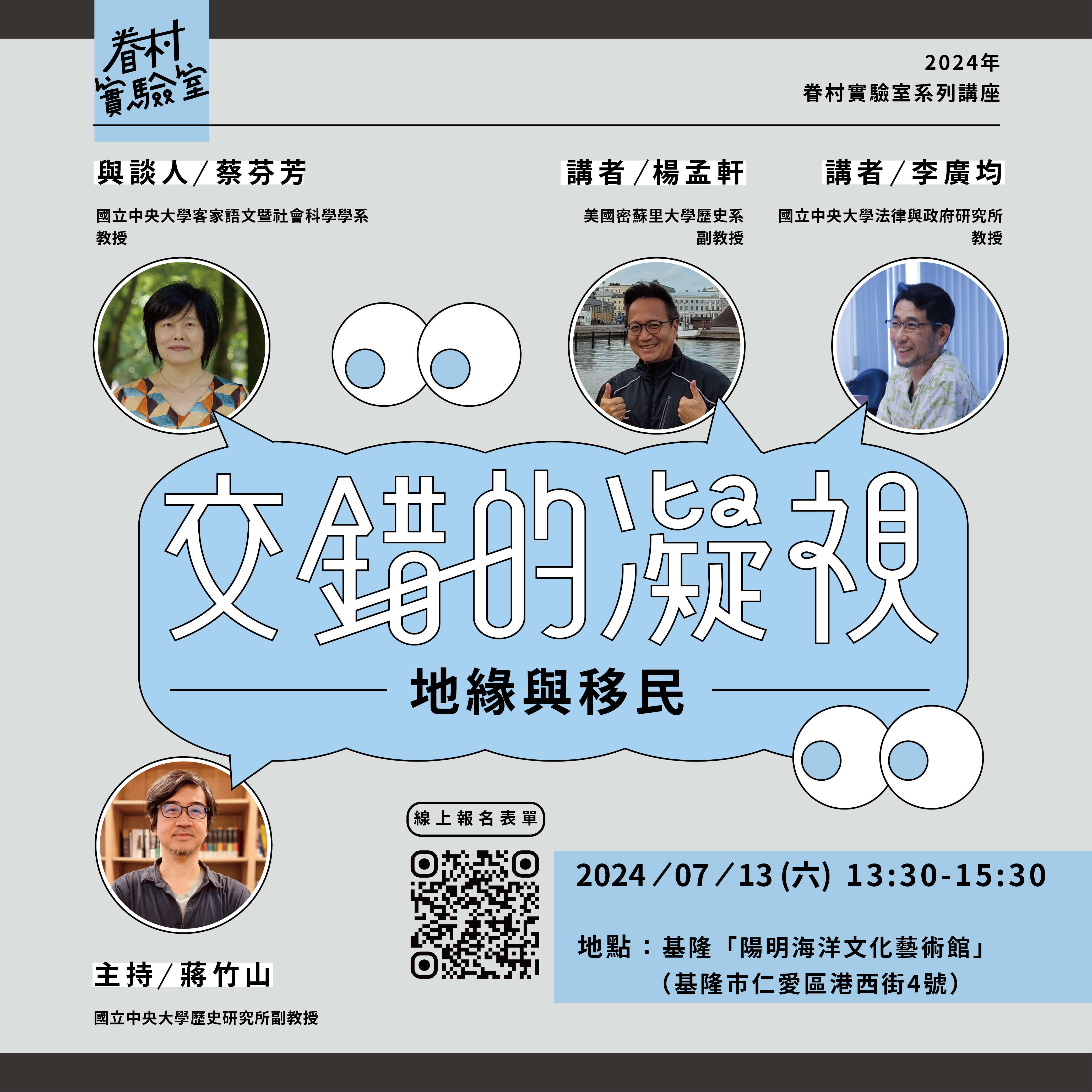 此次眷村實驗室講座《交錯的凝視——地緣與移民》,講座主題將以1949年前後因國民政府播遷至臺灣,百萬人飄洋過海,引發近代世界史上少見的大規模人口遷徙切入主軸,因戰後外省軍民來臺後多數集中在基隆港與高雄港上岸,故此次場次講座地點安排於基隆辦理,希望透過這些微觀的視角重新回望歷史洪流,交織彼此的生命經驗,逐步縫合當代臺灣的社會創傷。